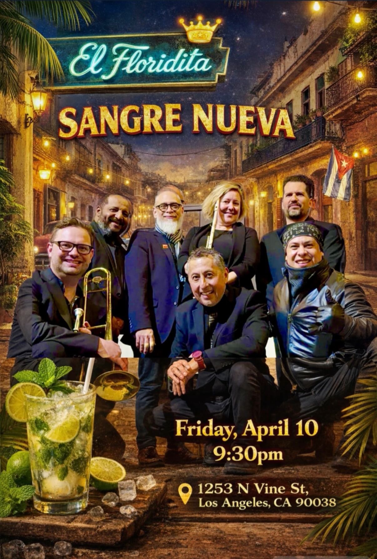 Sangre Nueva returns to perform their high energy Cuban music at 9:30pm - dance lesson with Oscar Ramirez at 8:30pm- 15 cover without dinner reservations