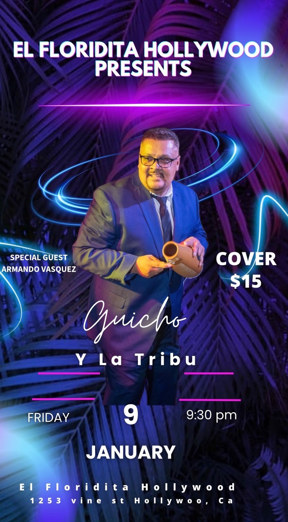 Luis Vasquez and Guicho y la Tribu band perform their exciting brand of salsa dura at 9:30pm- Dance Lesson with Oscar Ramirez at 8:30pm- Cover charge without dinner reservations