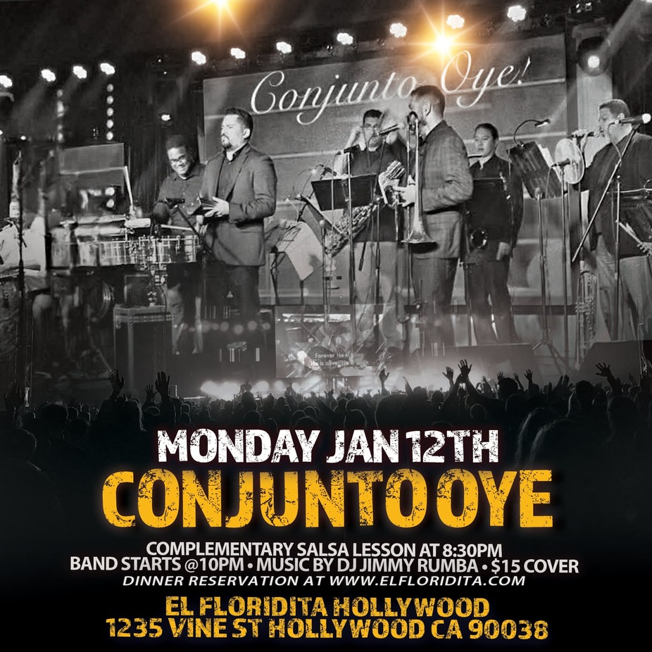 Monday Night live Salsa series welcomes back Conjunto Oye featuring new vocalist for the group, Marco Antonio Sariñana- performing their old school salsa dura at 9:30pm- Dance lessons and mixed music by DJ Jimmy Rumba at 8:30pm- 15 cover without dinner reservations