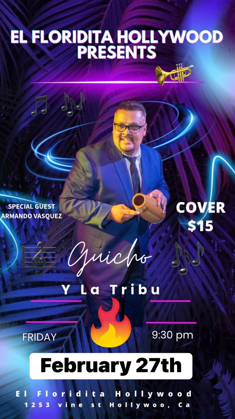 Luis Vasquez and Guicho y La Tribu perform their exciting brand of salsa dura , featuring guest vocalist Armando Vasquez at 9:30pm- Dance Lesson with Oscar Ramirez at 8.30pm- 15 cover